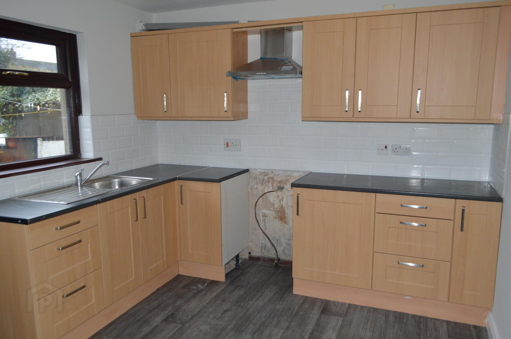 KITCHEN / DINETTE – 12’1x9’5 New fitted kitchen with range of high & low level units, stainless steel sink unit, new extractor fan, plumbed for washing machine, partially tiled walls, vinyl tiled flooring.