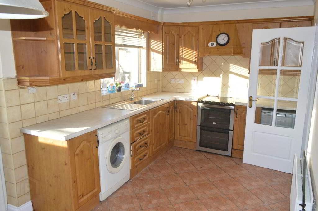 KITCHEN / DINETTE – 15’7x8’ Fitted kitchen with range of high & low level units, glass display cabinet, extractor fan, canopy, Zanussi free standing cooker, plumbed for washing machine, partially tiled walls, tiled flooring, walk-in storage space.