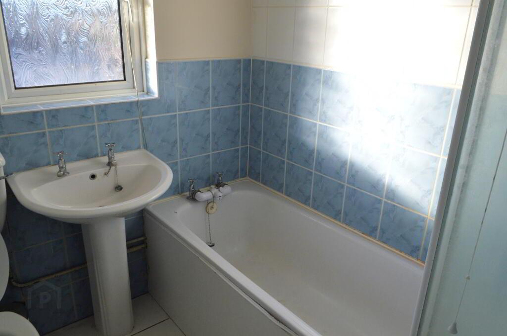 BATHROOM – White suite comprising of panelled bath with wall mounted shower & glass side screen, low flush wc, pedestal wash hand basin, tiled walls, tiled flooring.